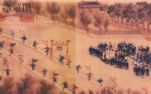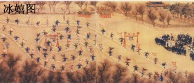 “冰嬉”,即在冰上进行的冰雪运动,包括抢等(速滑)、花样滑冰、滑雪、打冰嘎、拖冰床、冰上蹴鞠等。隋唐时期,我国北方的一些少数民族已经掌握了滑冰和滑雪技能。最初的滑冰是人站在“竹马”上,手持木棍撑地滑行;1400多年前,大兴安岭的室韦人发现两脚绑缚木板(长4尺,宽5寸),可在雪上疾驰,称作“骑木而行”,成为早期的滑雪。宋代出现了冰床,即数人坐在木板上,一人拉动木板在冰上滑行。《明宫史》中有描述明万历年间宫廷冰嬉场景诗词,称“琉璃新结御河水,一片光明镜面菱。西苑雪晴来往便,胡床稳坐快云腾。”由于冰雪运动在生产、生活中的重要地位,及其在军事上的独特作用,满族入关之后,冰嬉运动便盛行于清代,朝廷甚至将其与国语、骑射、摔跤一起定为“大清国俗”。据《满洲老档秘录》记载,后金天命八年(1623年)正月初二,努尔哈赤在辽阳太子河天然冰场,举行盛大的冰嬉“运动会”,项目有抢等、花样滑冰和冰上蹴鞠表演。胜者皆获重赏,一等赏银二十两,二等赏银十两;赛后还在冰上举行国宴以示庆贺。清朝历代帝王不仅对冰嬉高度重视,而且身体力行。按清朝国俗惯例,每年十二月要在西苑三海举行“冰嬉大典”。届时,皇帝驾幸瀛台等处,专门检阅八旗兵士的冰嬉技艺,冰嬉成为考核八旗冬训劳绩的方式和依据。《日下旧闻考》说:“太液池冬月表演冰嬉,习劳行赏,以阅武事,而修国俗。”乾隆皇帝不仅大力提倡冰嬉运动,将其定为“国俗”、“定制”、“年例”,使“冰嬉大典”得以延续百年之久,而且亲自考订冰嬉项目的沿革、名称、技法和器具;同时,他撰写了大量关于冰嬉运动的诗文,其中以《冰嬉赋》影响最大。此外,乾隆还组织名画家绘制冰嬉图画,如内廷供奉金昆等所画的《冰嬉图》长卷,描绘冰上转龙射球,表演者身着戎装,或背插彩旗,握幡而行;或在滑行中挽弓射球,千姿百态,各具神采。