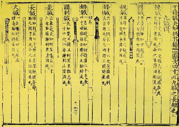 在这种经验的传递过程中,人们精制石器,作为固定的医疗器械,那就是所谓的砭石。锐利的砭石可以用来刺脓、放血,比较钝的砭石可以按压穴位,刺激穴位。随着人类的进步,发明了金属冶炼术,人们开始制造金属针具。由于金属针具更锐利,使用起来更为方便,很快就取代了砭石的位置。金属针具出现后,人们可以根据不同的医疗需求制造合适的针具。令人惊奇的是,当今非常时髦的标准化、规范化在遥远的古代也有体现,最晚到西汉时已经出现了针灸器具的规范,即《灵枢?官针》中记载的“九针”的形制。伴随金属针具的出现,针法也相应得到了发展,《黄帝内经》时代已经发展成为五刺、九刺、十二刺等多种刺法。