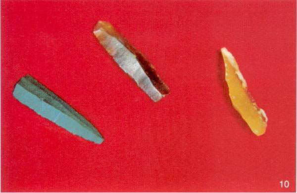 | 简介:新石器时代。内蒙古乌盟头道洼遗址出土。质地玛瑙,长约2cm。绿色一件,赭色两件,有锋刃,先民们可用于放血、破痈。现藏于陕西医史博物馆。 |