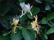 红腺忍冬:为多年生攀援灌木,叶卵形至卵状矩圆形,叶下面密生微毛并杂有橘红色腺体,有时粉红色。苞片线状披针形,与萼筒近等长;花冠白色,有时有淡红晕,后变金黄色。果实有时具白粉。花期4~6月。果期10~11月。