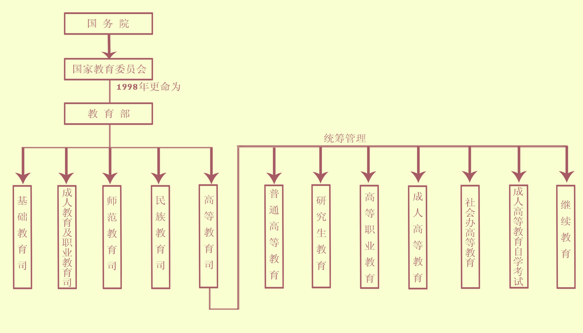 教育部是主管教育事业和语言文字工作的国务院组成部门,原为国家教育委员会,1998年更名为教育部。教育部下设职能机构见