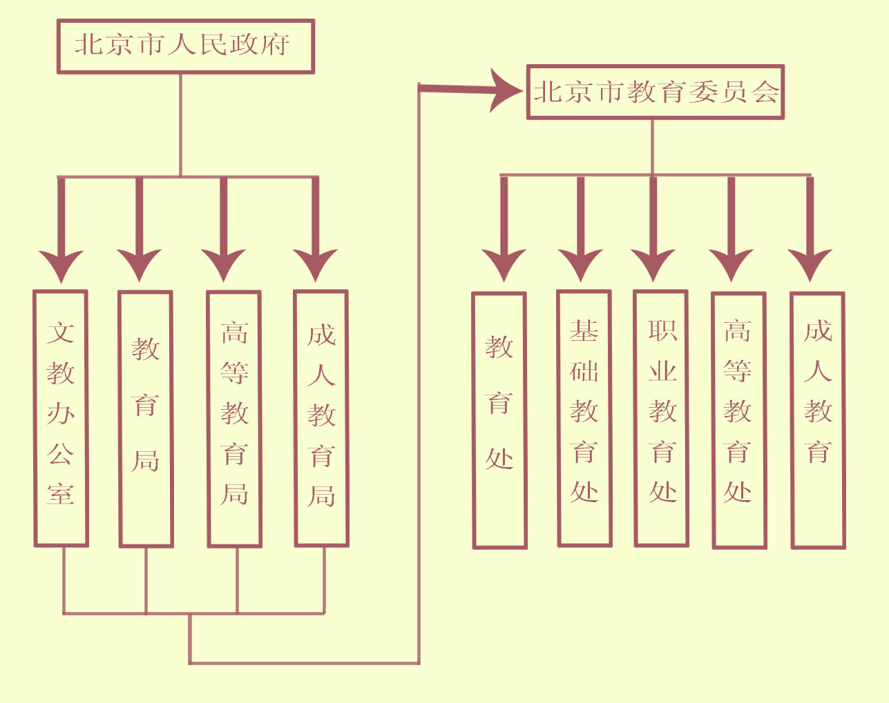 北京市人民政府文教办公室、北京市教育局、北京市高等教育局、北京市成人教育局,曾分别负责管理北京初、中等教育及职业教育、高等教育、成人教育等各类教育。1996年经国务院批准,北京市人民政府决定撤销以上机构,组建北京市教育委员会。北京市教育委员会成立后,负责统筹管理北京市的教育工作,下设机构见下