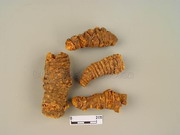 本品为圆柱状略弯曲的根茎,长4~13cm,直径0.6~2.5cm,顶端具茎痕。表面棕褐色至黑褐色,外皮脱落处呈黄色。节间缩短,呈紧密隆起的环状,形似蚕,习称“蚕羌”;节间延长,形如竹节状,习称“竹节羌”。节上有多数点状或瘤状突起的根痕及棕色破碎鳞片。体轻,质脆,易折断,断面不平整,有多数裂隙,皮部黄棕色至暗棕色,油润,有棕色油点,木部黄白色,射线明显,髓部黄色至黄棕色,气香,味微苦而辛。