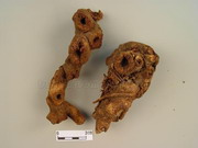 本品为不规则的长形块状,多分枝,呈结节状,长10~20cm,直径2~4cm。表面黑褐色或棕褐色,粗糙不平,有坚硬的细须根残留,上面有数个圆形空洞的茎基痕,洞内壁显网状沟纹;下面凹凸不平,具须根痕。体轻,质坚硬,不易折断,断面不平坦,有裂隙,纤维性,黄绿色或淡黄白色。气微,味微苦而涩。