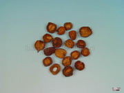 本品为圆形片,皱缩不平,直径1~2.5cm,厚0.2~0.4cm。外皮红色,具皱纹,有灰白色小斑点。果肉深黄色至浅棕色。,中部横切片具5粒浅黄色果核,但核多脱落而中空。有的片上可见短而细的果梗或花萼残迹。气微清香,味酸、微甜。