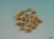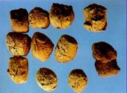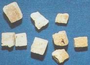 呈方形或长方形的块状,宽约3cm,厚约1cm,外表土黄色,粗糟,质硬脆易断,断面不平,类白色,可见未被粉碎的褐色残渣和发酵厚的空洞。有陈腐气,味苦。
