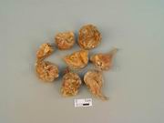 呈不规则扁球形或圆锥形,顶端渐突起,基部有须根痕。长1.8~3cm,膨大部直径1~2cm。表面黄棕色或棕褐色,有纵皱纹或纵沟,中部有2~3条微突起的环节,节上有鳞片叶干枯腐烂后留下的丝状纤维。质坚硬,难折断,断面灰白色或黄白色,略呈角质。气微,味淡,带黏性。