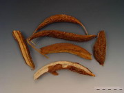 本品纵瓣呈长圆形或近纺锤形,长4~10cm,直径1~2cm。切面周边常向内卷曲,中部有1凸起的棱线;外皮红棕色或红褐色,有纵皱纹、细横纹及横长皮孔,易层层脱落,脱落处呈淡红棕色。斜片呈卵圆形,长2.5~5cm,宽2~3cm。切面类白色或浅红棕色,可见放射状纹理,周边较厚,微翘起或略弯曲。体轻,质硬脆,易折断,折断时,有粉尘飞出。气微,味甘。