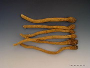 本品呈圆柱形,稍扭曲,长10~20cm,直径0.5~1cm。表面淡黄色或淡棕黄色,有纵皱纹及支根痕,皮孔横长。根头略膨大,可见暗绿色或暗棕色轮状排列的叶柄残基和密集的疣状突起。体实,质略软,断面皮部黄白色,木部黄色。气微,味微甜后苦涩。