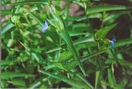 全草长约60cm,黄绿色,老茎略呈方形,表面光滑,直径约2mm,节膨大,基部节上有须根。断面坚实,中部有髓。叶互生,多皱缩成团,质脆易碎,完整叶片展平后呈卵圆状披针形,黄绿色,长3~9cm,宽1~3cm,先端尖,全缘,基部下延成膜质鞘,抱茎,叶脉平行。聚伞花序,总苞心状卵形,花多脱落,萼片膜质,花瓣蓝黑色。气微,味甘、淡。