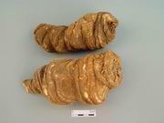 本品呈结节状扁圆柱形,略弯曲,长5~12cm,直径1.0~4.5cm。表面黄棕色或灰棕色,外皮脱落处呈白色;密具层状凸起的粗环纹,一面结节明显,结节上具椭圆形凹陷茎痕,另一面有疏生的须根或疣状须根痕。顶端具鳞叶及茎的残基。质坚实,断面平坦,白色至浅棕色,粉性或角质。无臭,味微苦、麻。