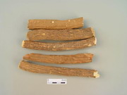 本品呈圆柱形,稍弯曲,长5~40cm,直径0.5~3cm。表面棕褐色,粗糙,有纵沟及皱纹,并有须根痕及横向凸起的皮孔,有的外皮易脱落。质硬而脆,易折断,断面粉白色或粉红色,皮部窄,木部放射状纹理明显,有的有裂隙。气微香,味微苦、酸涩。