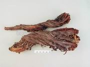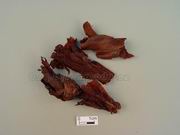 紫草(硬紫草):呈圆锥形,扭曲,有分枝,长7~14cm,直径1~2cm。表面紫红色或紫黑色,粗糙有纵纹,皮部薄,易剥落。质硬而脆,易折断,断面皮部深紫色,木部较大,灰黄色。