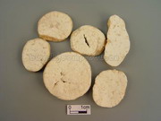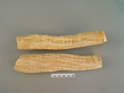 本品呈不规则圆柱形、纺锤形或瓣块状,长8~16cm,直径1.5~5.5cm。表面黄白色或淡棕黄色,有纵皱纹、细根痕及略凹陷的横长皮孔,有的有黄棕色外皮残留。质坚实,断面白色或淡黄色,富粉性,横切面可见黄色木质部,略呈放射状排列,纵切面可见黄色条纹状木质部。无臭,味微苦。