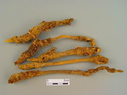 味连:多集聚成簇,常弯曲,形如鸡爪,单枝根茎长3~6cm,直径0.3~0.8cm。表面灰黄色或黄褐色,粗糙,有不规则结节状隆起、须根及须根残基,有的节间表面平滑如茎杆,习称“过桥”。上部多残留褐色鳞叶,顶端常留有残余的茎或叶柄。质硬,断面不整齐,皮部橙红色或暗棕色,木部鲜黄色或橙黄色,呈放射状排列,髓部有的中空。气微,味极苦。
