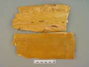 川黄柏:呈板片状或浅槽状,长宽不一,厚3~6mm。外表面黄褐色或黄棕色,平坦或具纵沟纹,有的可见皮孔痕及残存的灰褐色粗皮。内表面暗黄色或淡棕色,?具细密的纵棱纹。体轻,质硬,断面纤维性,呈裂片状分层,深黄色。气微,味甚苦,嚼之有黏性。