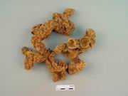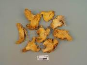 本品呈不规则结节状,长3~10cm,直径l~2cm。表面黄褐色、棕褐色或黑褐色,皱缩,有较密的环纹。上面有数个圆盘状凹陷的茎痕,偶有茎基残存;下面有残留细根及根痕。质硬,断面黄色,颗粒性。气微,味苦、微辛。