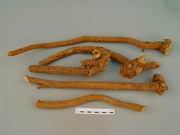 本品根茎呈不规则的结节状,顶端常残存茎基,其下着生根数条。根呈长圆柱形,常有分枝,长短不等,直径0.7~1.5cm。表面棕色至棕褐色,有不规则的纵皱纹及突起的横向皮孔。质坚硬,难折断,断面皮部浅棕色,木部淡黄色。有豆腥气,味极苦。