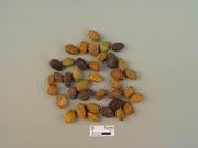 本品呈卵形,长6~10mm,直径4~7mm。表面黑色或棕色,有隆起的网状皱纹,网眼呈不规则的多角形,两侧有明显的棱线,顶端渐尖,基部有凹陷的果柄痕。果壳质硬而脆,种子卵形,长5~6mm,直径3~5mm,表面类白色或黄白色,具网纹;种皮薄,子叶乳白色,富油性。无臭,味极苦。
