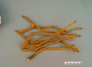 本品茎枝呈圆柱形,2~5叉状分枝,长约30cm,直径0.3~lcm;表面黄绿色、金黄色或黄棕色,有纵皱纹;节膨大,节上有分枝或枝痕。体轻,质脆,易折断,断面不平坦,皮部黄色,木部色较浅,射线放射状,髓部常偏向一边。叶对生于枝梢,易脱落,无柄;叶片呈长椭圆状披针形,长2~7cm,宽0.5~1.5cm;先端钝圆,基部楔形,全缘;表面黄绿色,有细皱纹,主脉5出,中间3条明显。革质。浆果球形,皱缩。无臭,味微苦,嚼之有黏性。