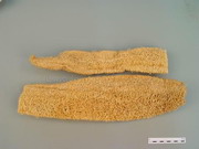 本品为丝状维管束交织而成,多呈长棱形或长圆筒形,略弯曲,长30~70cm,直径7~10cm。表面淡黄白色。体轻,质韧,有弹性,不能折断。横切面可见子房3室,呈空洞状。气微,味淡。