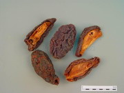 本品长圆形,多纵剖成两半,长4~9cm,宽2~5cm,厚1~2.5cm。外表面紫红色或红棕色,有不规则的深皱纹;剖面边缘向内卷曲,果肉红棕色,中心部分凹陷,棕黄色;种子扁长三角形,多脱落。质坚硬。气微清香,味酸。