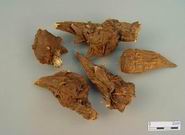 本品呈不规则长圆锥形,略弯曲,长2~7cm,直径0.6~1.8cm。顶端常有残茎和少数不定根残基,有的顶端一侧有一枯萎的芽,一侧有一圆形或扁圆形不定根残基。表面灰褐色或黑棕褐色,皱缩,有纵皱纹、点状须根痕和数个瘤状侧根。质硬,断面灰白色或暗灰色,有裂隙,形成层环纹多角形或类圆形,髓部较大或中空。无臭,味辛辣、麻舌。