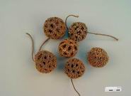 本品为聚花果,由多数小蒴果集合而成,呈球形,直径2~3cm。基部有总果梗。表面灰棕色或棕褐色,有多数尖刺及喙状小钝刺,长0.5~lmm,常折断,小蒴果顶部开裂,呈蜂窝状小孔。体轻,质硬,不易破开。气微,味淡。