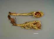 全草干缩呈棉花团状,上宽下窄,略成倒圆锥形,长10~30cm。全体密被白色或淡黄色长毛。根茎粗壮,表面棕褐色,外皮易剥落,有残留叶柄;叶密集,倒披针形或匙形,枯绿或棕色,两面均有毛;头状花序多数,在茎上部排成椭圆形穗状,总苞半球形,外层苞片条状披针形,有白色绵毛,内层披针形,有黑褐色长毛。花白色,常脱落。瘦果长约3mm;冠毛黑褐色。气微,味淡。