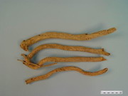 本品呈近圆柱形,微扭曲,向下略细或有少数分枝,长30~60cm,直径0.5~3cm。表面黄棕色或灰褐色,具纵皱纹、支根痕和多数横向突起的皮孔。质韧,不易折断,断面浅黄色或棕黄色,维管束