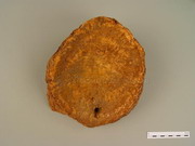 本品呈类圆柱形、圆锥形、卵圆形或不规则块状,长3~17cm,直径3~10cm。除尽外皮者表面黄棕色至红棕色,有的可见类白色网状纹理及星点(异型维管束)散在,残留的外皮棕褐色,多具绳孔及粗皱纹。质坚实,有的中心稍松软,断面淡红棕色或黄棕色,显颗粒性;根茎髓部宽广,有星点环列或散在;根木部发达,具放射状纹理,形成层环明显,无星点。气清香,味苦而微涩,嚼之粘牙,有砂粒感。