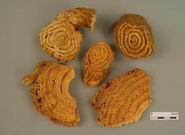 本品为横切或纵切的不规则块片,厚薄不等。外皮灰黄色或灰棕色。横切片弯曲不平,边缘皱缩,直径2~8cm,切面浅黄棕色或黄白色,木部隆起,形成数个突起的同心性环轮。纵切片弯曲或卷曲,长5~8cm,宽1~2cm,木部呈平行条状突起。质硬。气微,味稍甜,久嚼麻舌。