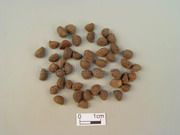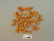本品似橘瓣状,长4~8mm,宽3~5mm。表面灰黑色或淡黄白色,背面有一条浅纵沟,腹面棱线的下端有一点状种脐,微凹。质硬,横切面可见淡黄色或黄绿色皱缩折叠的子叶,微显油性。无臭,味苦,有麻感。