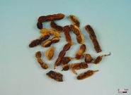 本品呈连珠状,长1~6cm,直径0.6~lcm。表面黄绿色或黄褐色,皱缩而粗糙,背缝线一侧呈黄色。质柔润,干燥皱缩,易在收缩处折断,断面黄绿色,有黏性。种子1~6粒,肾形,长约8mm,表面光滑,棕黑色,一侧有灰白色圆形种脐;质坚硬,子叶2,黄绿色。果肉气微,味苦,种子嚼之有豆腥气。