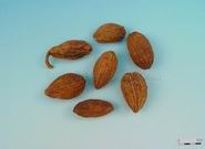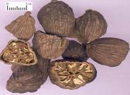 本品呈长椭圆形,具三钝棱,长2~4cm,直径1~2.5cm。表面灰棕色至红棕色,具纵沟及棱线,顶端有圆形突起的柱基,基部有果梗或果梗痕。果皮质坚韧,易纵向撕裂。剥去外皮,中间有黄棕隔膜,将种子团分成3瓣,每瓣有种子多为8~11粒。种子呈圆锥状多面体,直径约5mm;表面红棕色,被灰白色膜质的假种皮,种脊为一条纵沟,尖端有凹状的种脐;质硬,胚乳灰白色。有特异香气,味辛,微苦。