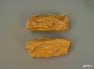 琥珀:为不规则的块状、颗粒状或多角形,大小不一,块状者可长达6cm。血红色或黄棕色,表面不平,有光泽。质松脆,捻之即成粉末。气无,味淡,嚼之易碎无沙感。以火燃之易熔,爆炸有声,冒白烟,微有松香气。