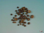 个青皮:呈类球形,直径0.5~2cm。表面灰绿色或黑绿色,微粗糙,有细密凹下的油室,顶端有稍突起的柱基,基部有圆形果梗痕。质硬,断面果皮黄白色或淡黄棕色,厚0.1~0.2cm,外缘有油室1~2列,瓤囊8~10瓣,淡棕色。气清香,味酸、苦、辛。