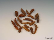 本品多呈纺锤形,有的略弯曲,长2~3.5cm,直径0.5~lcm。表面棕褐色或黑褐色,有纵皱纹,并有6~10个略隆起的环节,节上有未除净的棕色毛须及须根断痕;去净毛须者较光滑,环节不明显。质硬,经蒸煮者断面黄棕色或红棕色,角质样;生晒者断面色白而显粉性,内皮层环纹明显,中柱色较深,点状维管束散在。气香,味微苦。