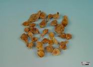 呈不规则卵圆形,高0.5~1.5,直径0.5~1.8cm。表面黄白色或淡黄棕色,皱缩,半透明,有类白色膜质鳞片包被,底部有突起的鳞茎盘。质硬,角质样。有蒜臭,味微辣。