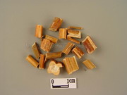 本品呈方柱形,四棱钝圆,长短不一,直径0.5~1.5cm。表面紫棕色或暗紫色,四面有纵沟及细纵纹,节部稍膨大,有对生的枝痕和叶痕。体轻,质硬,断面裂片状。切片厚2~5mm,常呈斜长方形,木部黄白色,射线细密,呈放射状,髓部白色,疏松或脱落。气微香,味淡。