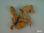 本品为不规则的肥厚团块,长3~13cm,直径1.5~7cm。表面灰黄色或灰棕色,有瘤状突起及断续的纵皱和沟纹,并有须根痕,顶端有残留茎基和芽痕。质坚硬不易折断,断面不平坦,黄白色至淡棕色,有棕黄色的点状油室散在;烘干者断面角质样,色较深或有裂隙。气清香,味甘、微辛,嚼之略带黏性。