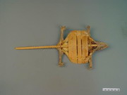 本品呈扁片状,头颈部及躯干部长9~18cm,头颈部约占三分之一,腹背部宽6~1lcm,尾长6~l0cm。头略呈扁三角状,两眼多凹陷成窟窿,口内有细齿,生于颚的边缘,无异型大齿。吻部半圆形,吻鳞不切鼻孔,与鼻鳞相连,上鼻鳞左右各l片,上唇鳞12~14对,下唇鳞(包括颏鳞)21片。腹背部呈椭圆形,腹薄。背部呈灰黑色或银灰色,有黄白色或灰绿色斑点散在或密集成不显著的斑纹,脊椎骨及两侧肋骨突起。四足均具5趾;趾间仅具蹼迹,足趾底有吸盘。尾细而坚实,微现骨节,与背部颜色相同,有6~7个明显的银灰色环带。全身密被圆形或多角形微有光泽的细鳞,气腥,味微咸。