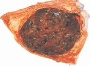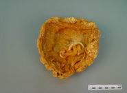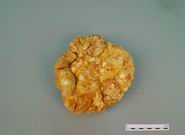 本品呈圆形或碟状椭圆形,直径9~15cm,厚薄不一。黄色或黄棕色,一面凹凸不平,有不规则沟纹,另一面较平滑,常附有残余的脐带,其四周有细血管。质硬脆,有腥气。