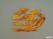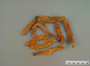 本品呈长圆柱形,略扁,少有分枝,长4~18cm,直径0.3~1.6cm。表面黄白色或淡黄棕色,半透明,具纵皱纹及微隆起的环节,有白色圆点状的须根痕和圆盘状茎痕。质硬而脆或稍软,易折断,断面角质样或显颗粒性。气微,味甘,嚼之发黏。