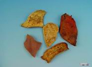 本品呈不规则的片状或瓢状,大小不一,厚1.5~3mm。外表面红棕色、棕黄色或暗棕色,略有光泽,粗糙,有多数疣状突起,有的有突起的筒状宿萼及粗短果梗或果梗痕。内表面黄色或红棕色,有隆起呈网状的果蒂残痕。质硬而脆,断面黄色,略显颗粒状。无臭,味苦涩。