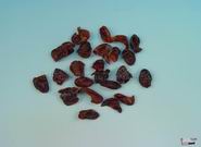 本品呈不规则的片状或囊状,长1~1.5cm,宽0.5~1cm。表面紫红色至紫黑色,皱缩,有光泽。顶端有的有圆形宿萼痕,基部有果梗痕。质柔软。气微,味酸、涩、微苦。
