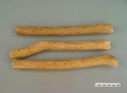 本品呈长圆柱形,稍扭曲,长1~2m,直径1~6cm。表面灰黄色或棕黄色,有浅纵沟及棕褐色残余粗皮的斑点。节部稍膨大,有1枝痕。体轻,质硬,不易折断,断面黄色或淡黄色,皮部薄,木部宽广,有多层整齐环状排列的导管,射线放射状,髓部不明显。摩擦残余粗皮,有樟脑样臭。气微,味苦。