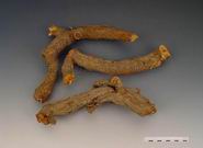 本品多为圆柱形短段或不规则厚片,长1~7cm,直径0.5~2.5cm。外皮棕褐色,有纵皱纹及须根痕,切面皮部较薄,木部宽广,棕黄色,射线放射状,皮部与木部较易分离。根茎髓中有隔或呈空洞状。质坚硬。气微,味微苦、涩。