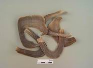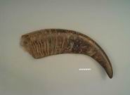 本品呈稍扁平而弯曲的锥形,长短不一。表面棕黑色或灰黑色,一侧有数条横向的沟槽,另一侧有密集的横向凹陷条纹。上部渐尖,有纵纹,基部略呈三角形,中空。角质,坚硬。气微腥,味淡。
