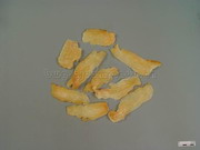 本品呈椭圆形或长条形,略扁,皱缩而稍弯曲,长3~15cm,宽1.5~6cm,厚0.5~2cm。表面黄白色至淡黄棕色,有纵皱纹及由潜伏芽排列而成的横环纹多轮,有时可见棕褐色菌索。顶端有红棕色至深棕色鹦嘴状的芽或残留茎基;另端有圆脐形疤痕。质坚硬,不易折断,断面较平坦,黄白色至淡棕色,角质样。气微,味甘。